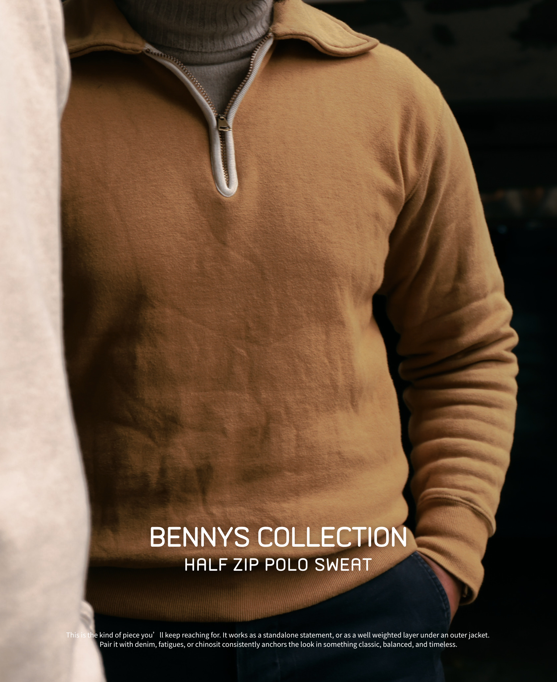 專注於經典服飾領域的 Benny’s Collection ,今年與日本老字號 Cushman 合作,推出自家版本的 Half Zip Sweater。