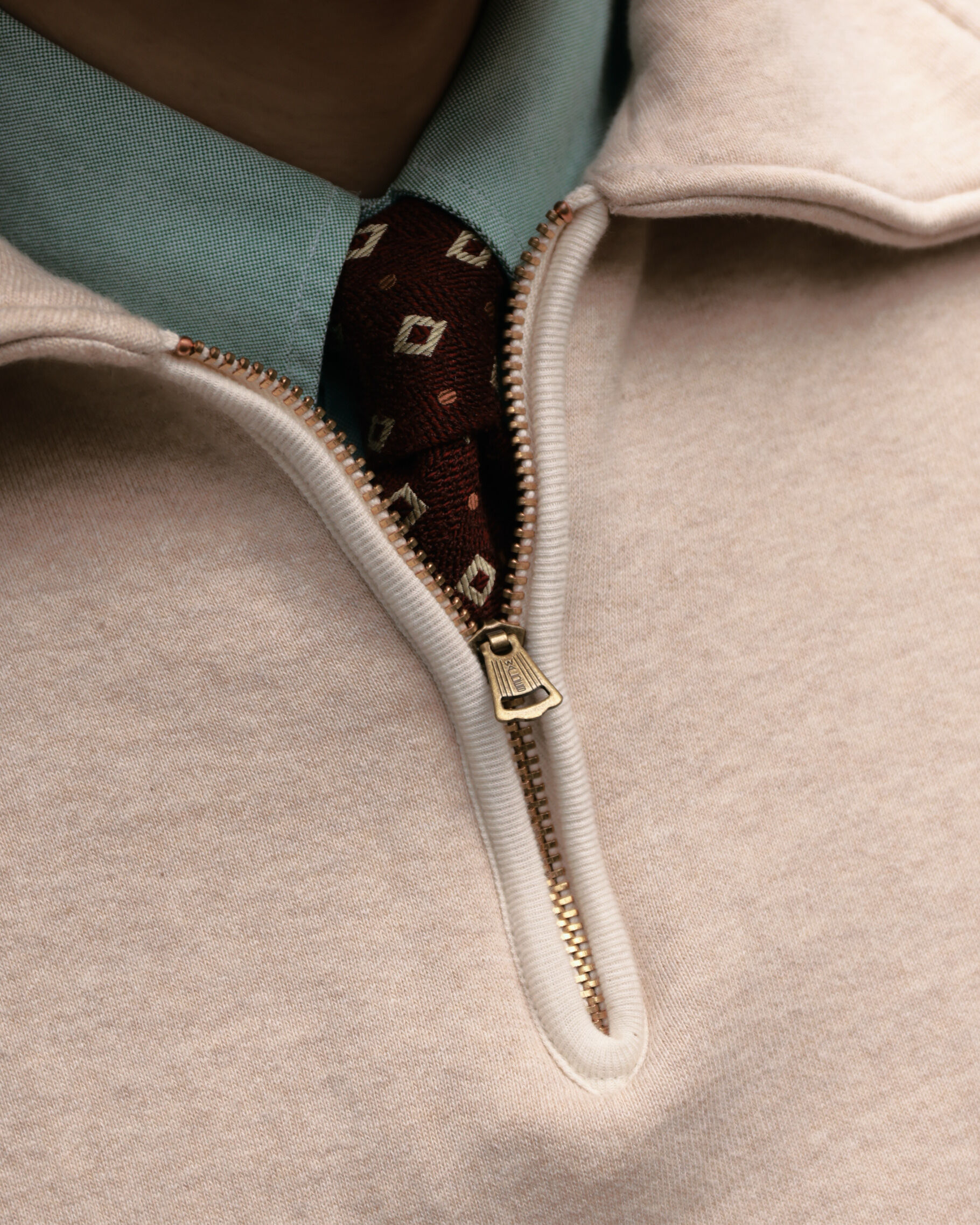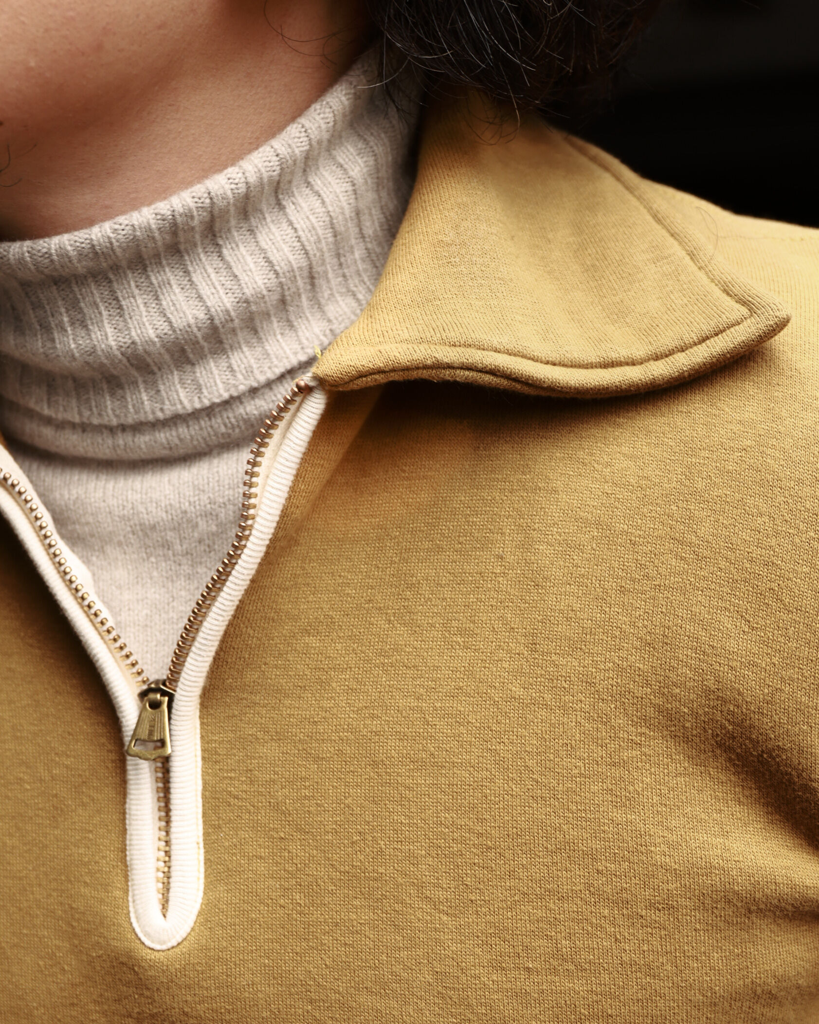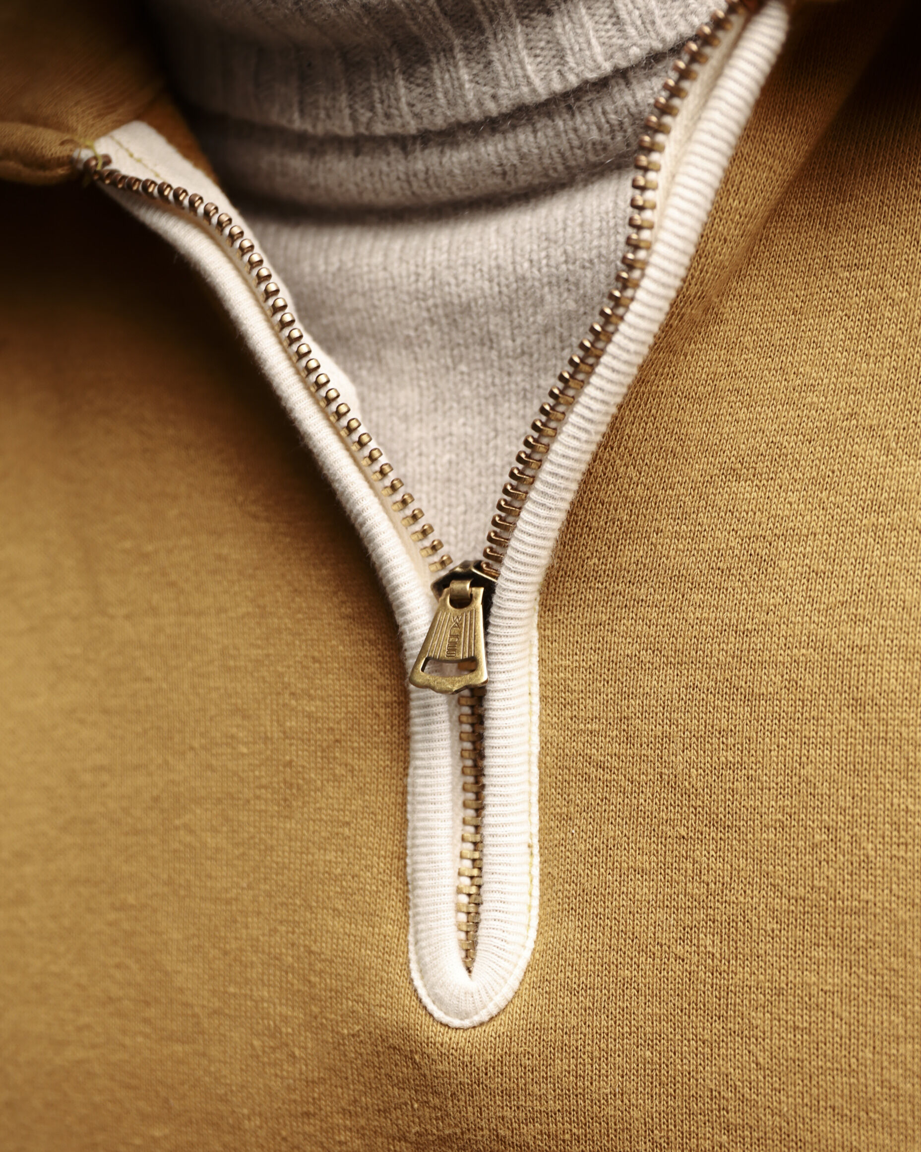 領部拉鍊特別參考二戰時期飛行員穿在 A-2 皮衣內側,作為保暖內搭的 C-2 拉鍊設計,即便戴手套也能順暢操作;螺紋長度亦經反覆調整,確保整體比例俐落。